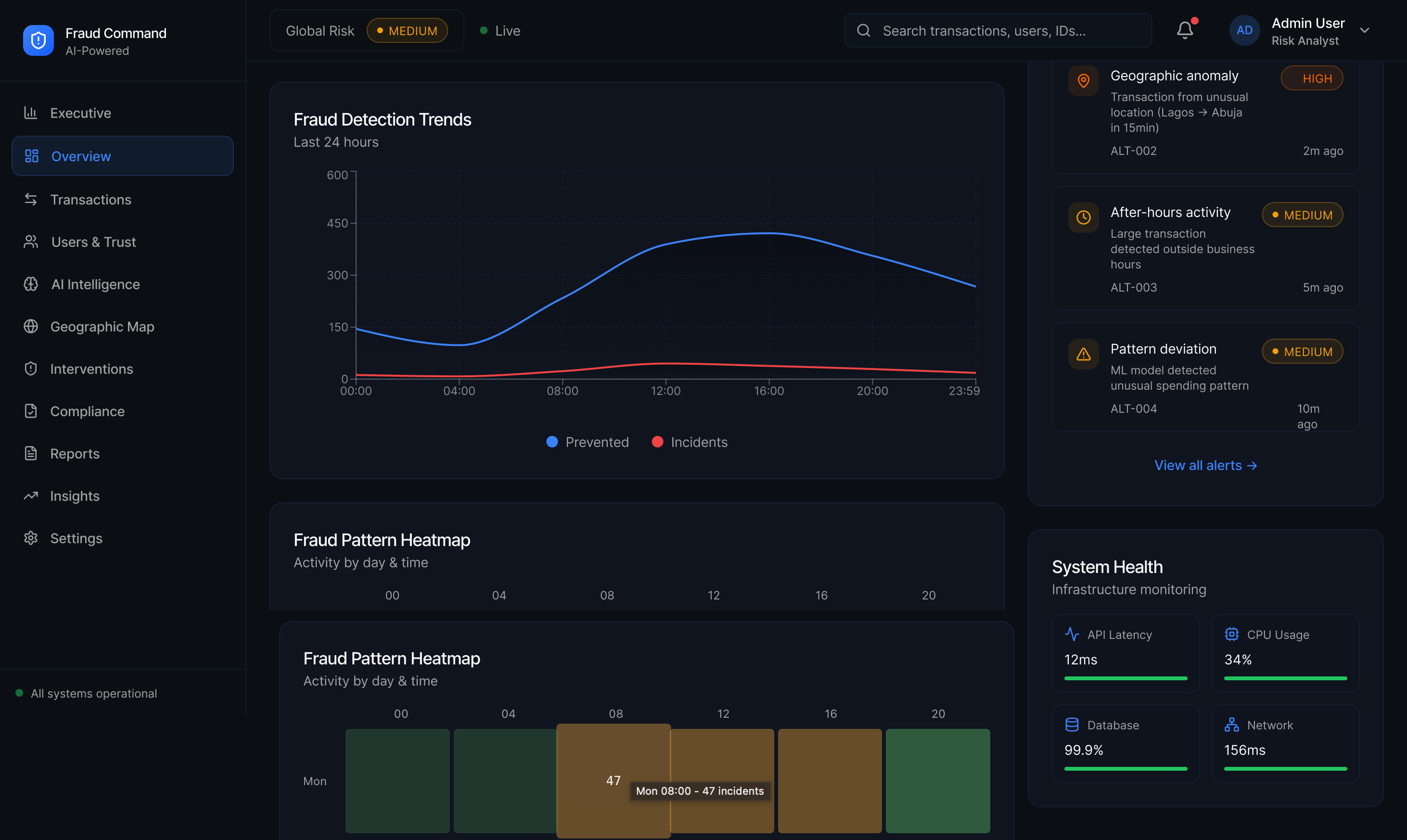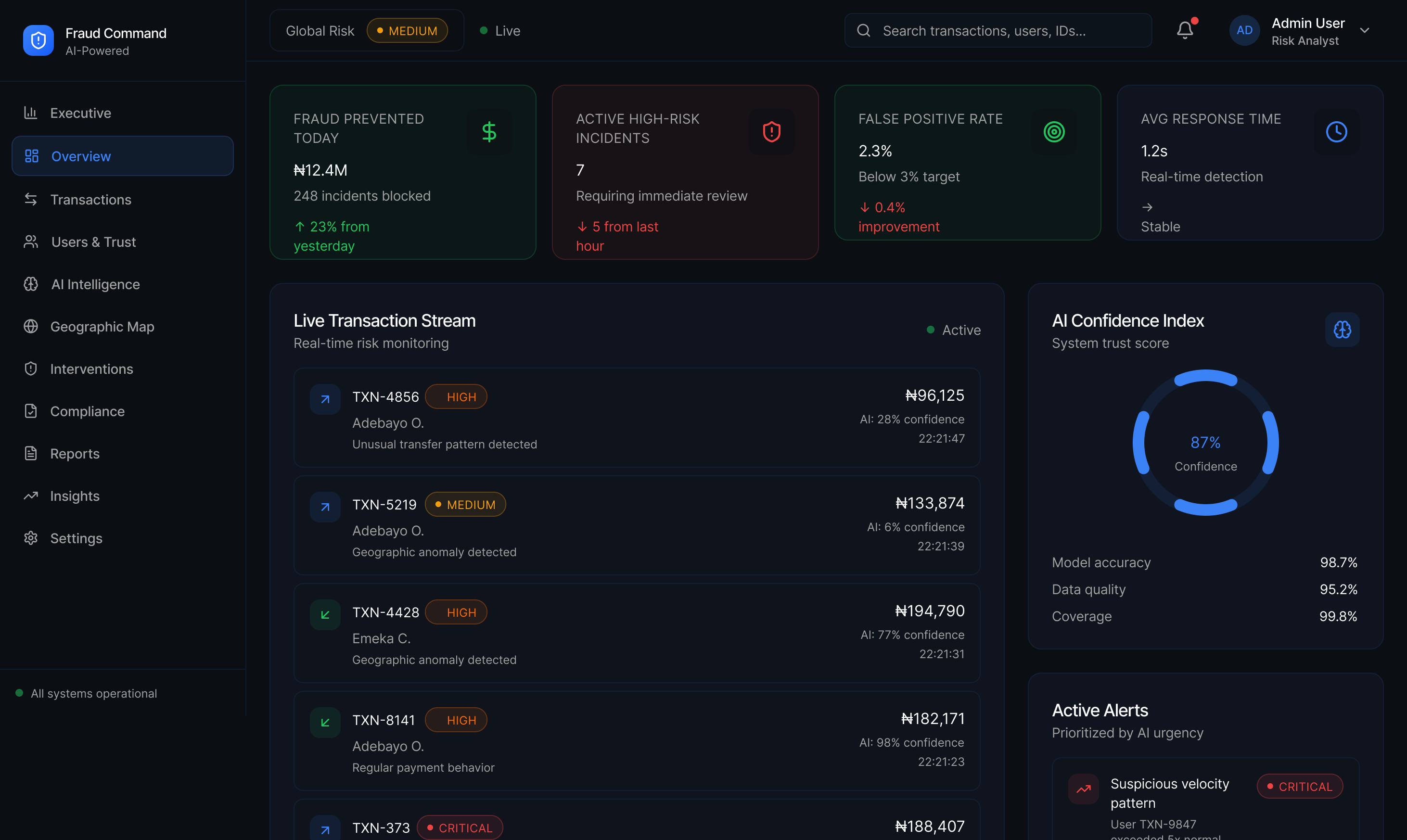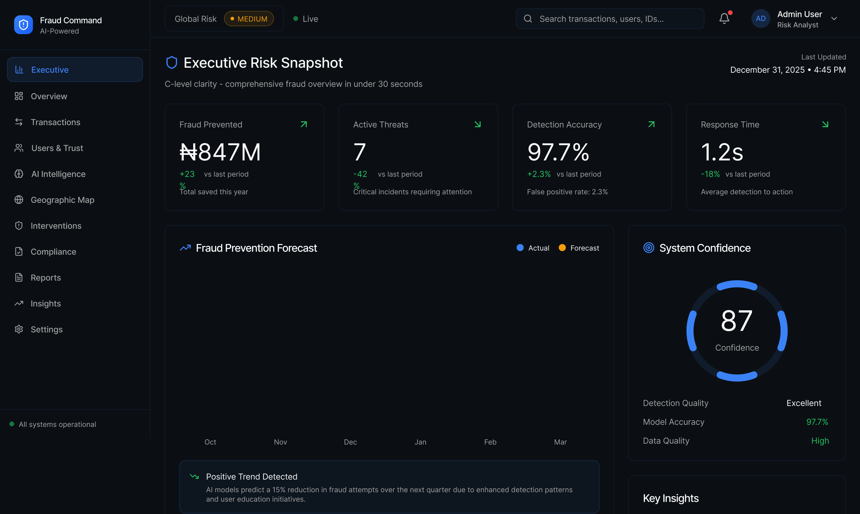 ✔ KPI cards: High-impact KPI cards (fraud prevented, active risks, response time, confidence index)