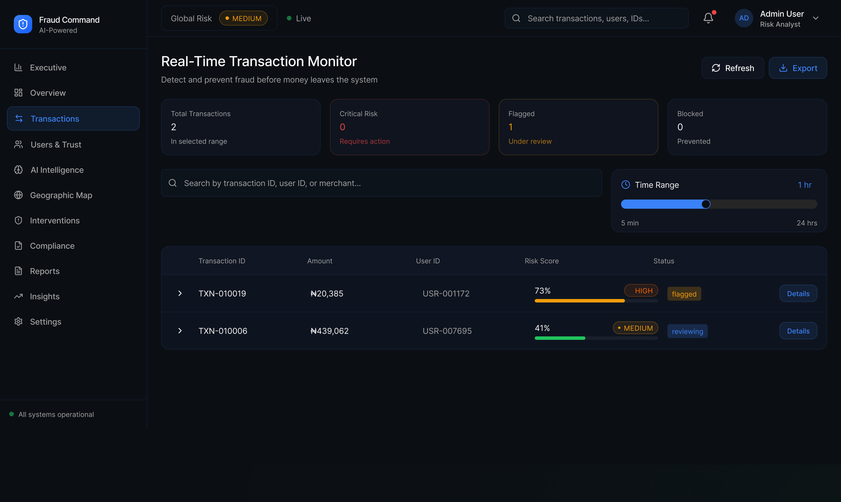 ✔ Transactions: Live transaction stream with color-coded risk badges