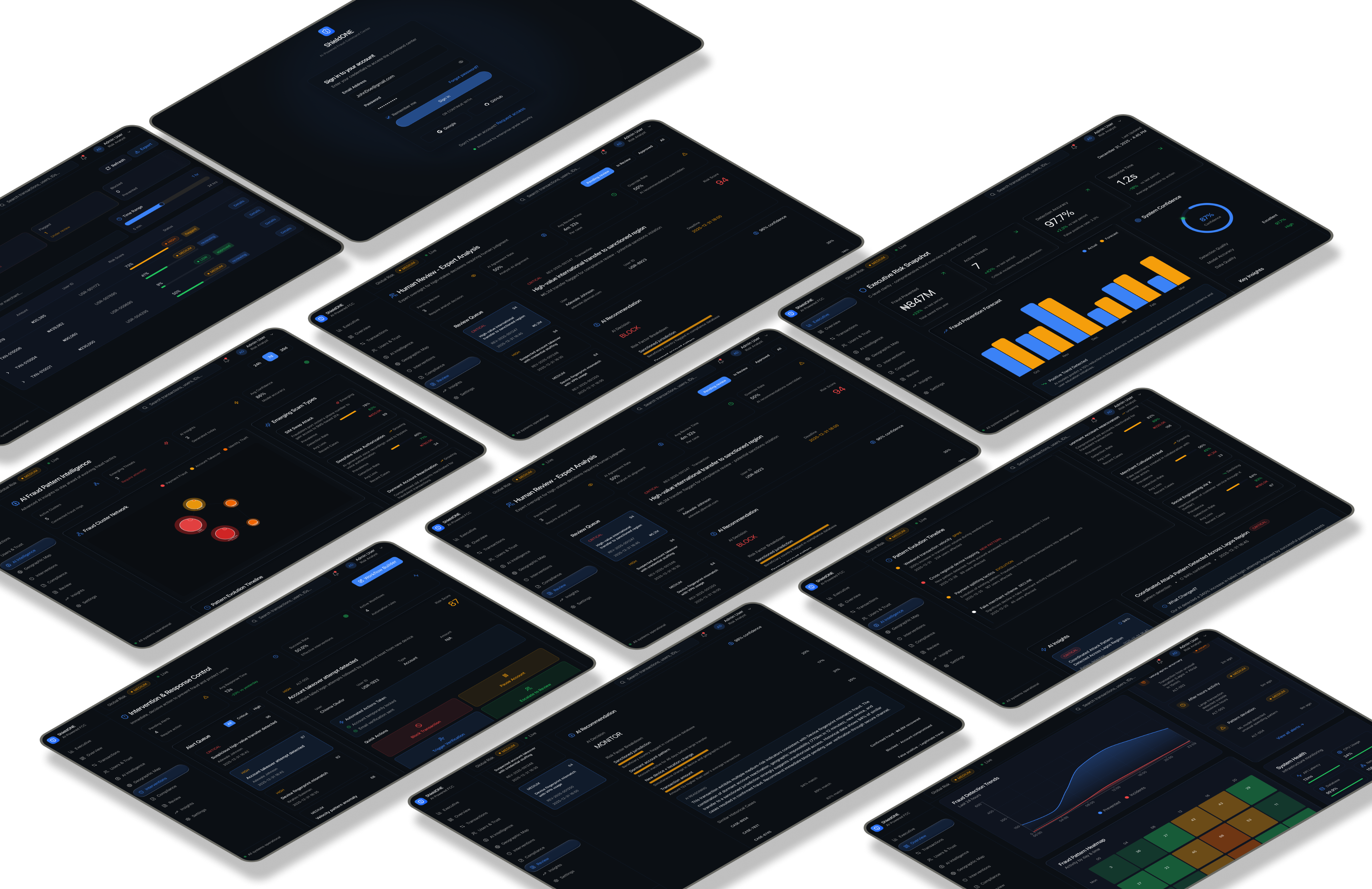 These insights led me to design ShieldONE as a multi-layered system rather than a single dashboard. I created role-based views ranging from a high-level command center to live risk monitoring, human-in-the-loop reviews, and compliance reporting while maintaining a shared data foundation. Throughout, I focused on balancing dense real-time data with clarity and scannability to support fast, confident decisions.