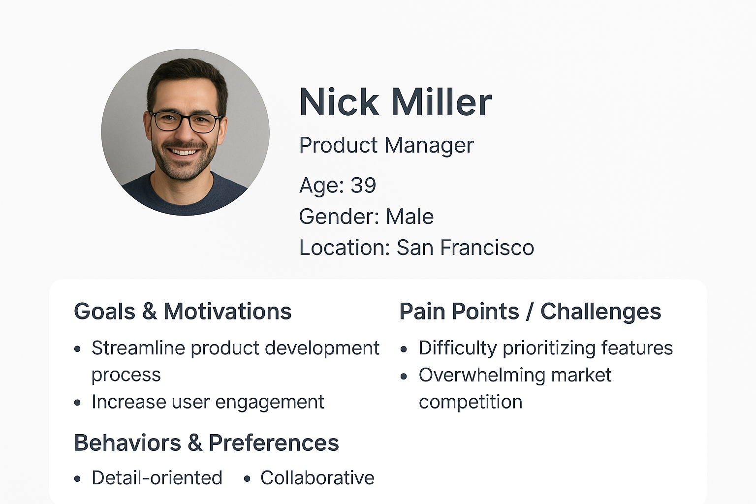 “Who are we designing for?” Creating personas is a valuable step in ensuring that the user experience is shaped around the needs, behaviors, and goals of real users. To provide true value, personas are always grounded in research and real data, not assumptions. I use personas to help teams empathize with users and keep their perspectives at the center of decision-making. Throughout the design process, I often refer back to personas to validate ideas and ensure that every experience is crafted through the user’s lens.